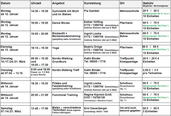 *) Bei Kleingruppen unter der Mindestteilnehmerzahl 15 € Aufpreis/Kurs. Bei Gruppen unter 6 Personen evtl. Absage des Kurses.